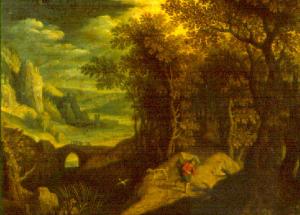 A sinistra in primo piano, su un roccione con alberi, cammina una piccola figura maschile di portatore; dietro un cane fissa un uccello in volo. A destra in secondo piano ponte in roccia su fiume attraversato da due figure con asino e sullo sfondo paesaggio con rocce e borgo fortificato.