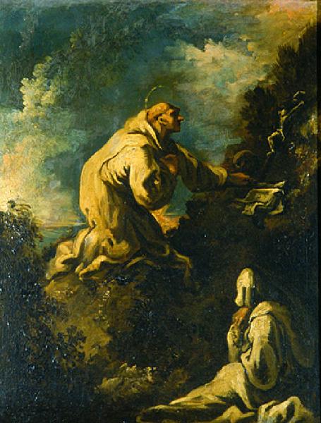 San Bruno, inginocchiato di profilo verso destra sul costone di una collina, porta al petto la mano destra, appoggiandosi al terreno con la sinistra, e adora il crocifisso posto di fronte a lui, accanto al quale si trovano un teschio ed un libro (?); a sinistra, in primo piano, un altro monaco certosino con il capo coperto siede di profilo in preghiera.