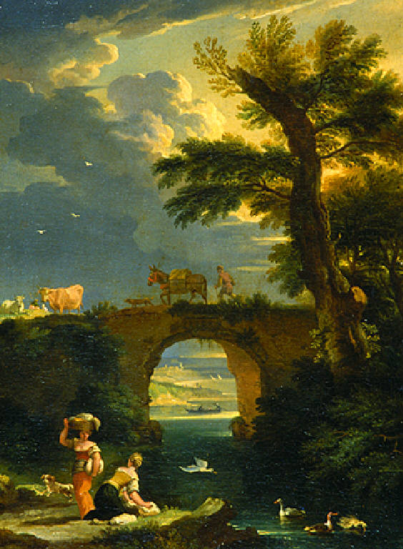 In primo piano a sinistra sono due figure femminili: l'una intenta a lavare sul greto del fiume è di spalle e volge il capo verso l'altra che è in piedi, porta sul capo un cesto di panni, ne tiene altri sotto braccio, accanto a lei un cane sta per correre; sulla destra è un gruppetto di papere, sovrastate da un grande albero fronzuto. Il quadro è diviso a metà dal ponte su unica arcata, sopra il quale sta passando un asino con il suo basto, seguito da un uomo con bastone e cane; all'estremità sinistra si trova un pastore con due mucche; in lontananza si scorge una barca e il profilo sinuoso della riva del fiume.
