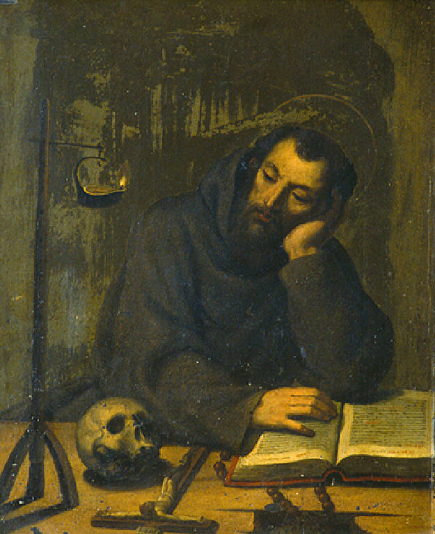 San Francesco in meditazione seduto ad un tavolo, dove sono una lucerna accesa su alto supporto, un teschio, il crocefisso, il rosario ed un libro aperto.