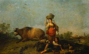 Al centro del paesaggio una donna in piedi, appoggia ad un bastone una mano, con l'altra sorregge il cesto che porta sul capo; ai suoi piedi, un pastorello seduto in terra ha accanto a sé un cane ed indica con la mano un cesto poggiato sul prato; una mucca è accucciata in secondo piano.
