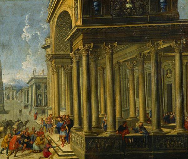 A destra, sotto l'arco di una profonda loggia retta da colonne corinzie poggianti su una base con fregio figurato, si svolge la scena principale: un uomo in piedi, riccamente abbigliato e circondato da altri personaggi, riceve un nutrito gruppo di uomini, che gli rendono omaggio inginocchiandosi; sul lato destro e sullo sfondo, altri edifici di struttura classica, sulla sinistra si intravede una piazza con obelisco centrale.