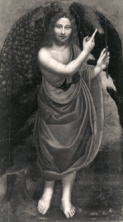 Gesù Cristo in piedi indica con la destra la croce tenuta nella sinistra. In secondo piano alberi e foglie.