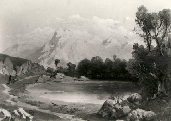 Il piccolo lago è per metà circondato di alberi, per metà da un sentiero su cui si muove un uomo con cane; sullo sfondo, montagne.