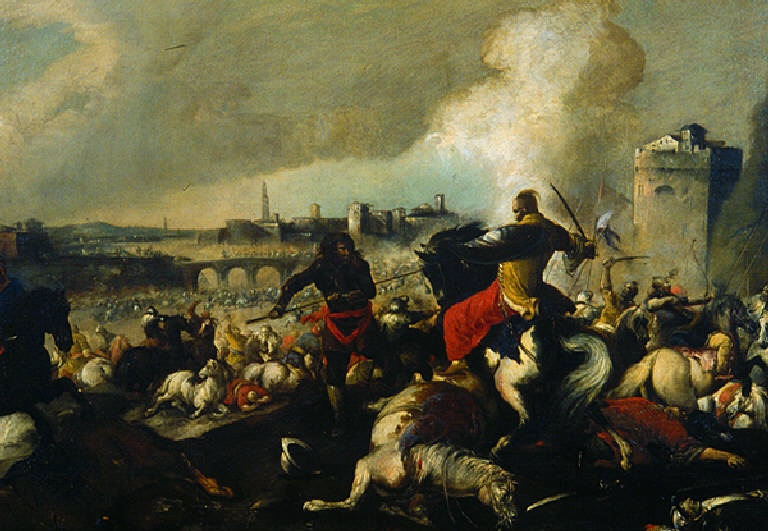 Al centro, un soldato appiedato affronta con una lancia un cavaliere turco che brandisce una scimitarra; in primo piano sulla destra, un cavallo e due soldati morti, in secondo piano cavalieri turchi armati d'arco; in secondo piano, una affollata scena di battaglia sul greto di un torrente e sopra un ponte che porta ad una città turrita.