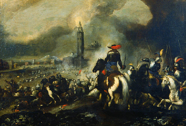 Scena di battaglia con gruppo di cavalieri armati di spade e lance, in primo piano, incentrato sulla figura di spalle di un ufficiale che osserva da posizione dominante, il campo di battaglia. Sullo sfondo, una città con al centro un alto campanile e una rocca restrostante sotto un cielo coperto da grandi nubi.