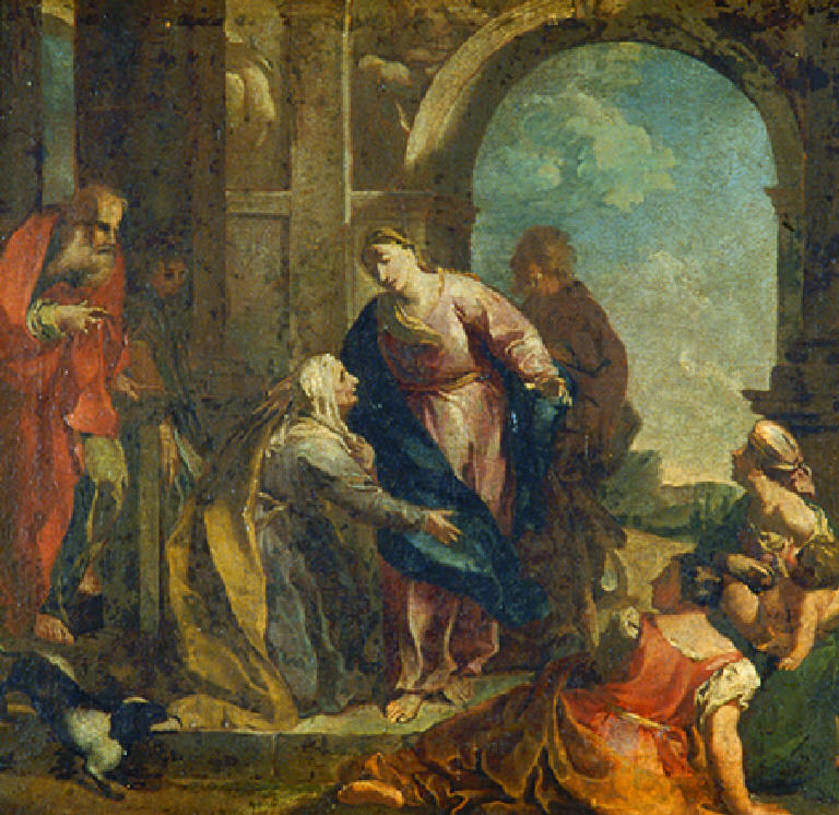 Al centro della scena, inginocchiata e di profilo, Santa Elisabetta accoglie Maria, che, in piedi, poggia la mano sinistra sulla spalla della donna anziana; a destra due donne assistono alla scena, l'una in primo piano di spalle e seduta in terra, l'altra di profilo, con il capo fasciato e un bimbo in braccio; a sinistra figura di anziano barbuto e in primo piano un cagnolino, alle spalle di Maria un'altra figura maschile e una imponente architettura voltata.