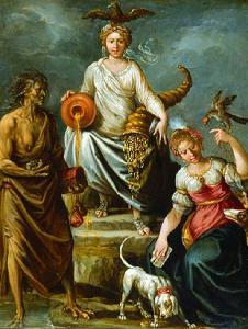 Al centro, seduta frontalmente, giovane donna sul cui capo sta un'aquila ad ali spiegate; il personaggio regge con la destra un'anfora dalla quale esce dell'acqua e con la sinistra una cornucopia dalla quale cadono monete e gioielli; a sinistra, in piedi e volta di tre quarti verso destra, figura di vecchia con il seno scoperto e con artigli al posto di mani e piedi che tiene un piccolo scrigno e dei sacchetti di monete(?); a destra figura di giovane donna seduta che tiene nella mano destra carte da gioco e sul braccio sinistro alzato un uccello rapace (falco ?) ed è circondata da cani.