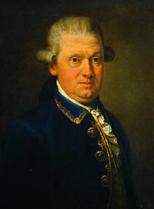Il personaggio è di tre quarti, il viso volto verso il riguardante e incorniciato dalla parrucca canuta; dalla giacca con collo ricamata e ricchi bottoni si intravede il pizzo e il panciotto.