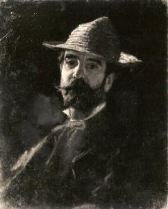 Il pittore si ritrae a mezzo busto e posto di tre quarti; indossa un cappello di paglia, un camice da pittore chiuso da un fiocco; il viso è colpito sul lato sinistro dalla luce ed è incorniciato da una folta barba scura.