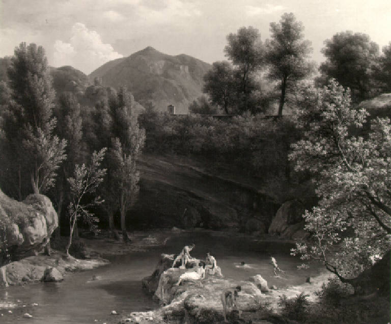 In primo piano dei bagnanti in vari atteggiamenti sulle sponde di un piccolo lago, sullo sfondo il paesaggio con monti e la torre campanaria di una chiesa che si intravede tra le fronde.