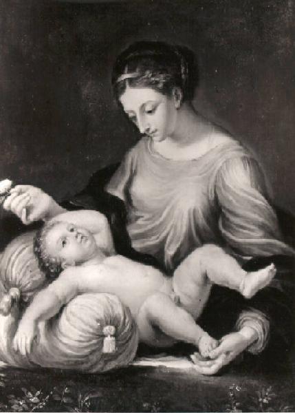 La Madonna tiene tra le braccia Gesù Bambino ignudo appoggiato a due cuscini.