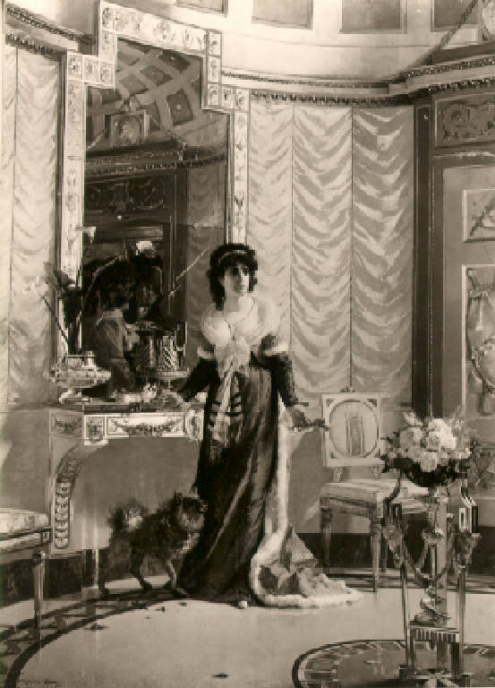 In una stanza arredata in stile neoclassico, la donna con abito stile impero, è in piedi davanti ad una consolle con specchio, nel quale si vedono i militari venuti ad arrestarla; ai suoi piedi, un cagnolino.