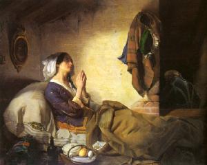 Una donna giace in una misera soffitta su un pagliericcio, e prega col le mani giunte; davanti a lei, in primo piano, un cesto di cibarie e bottiglie, mentre sulle pareti sono appesi un quadro con Gesù Cristo, un rametto d'ulivo ed i suoi laceri vestiti; a destra, si scorge di spalle la figura di un servitore in livrea che piangendo scende le scale.