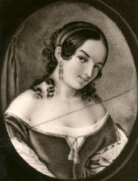 Donna giovane a mezzo busto, le testa reclinata su un fianco; lunghi capelli trattenuti da un nastro.