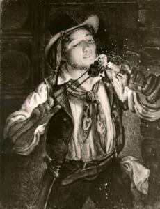 In piedi al centro del dipinto un uomo in abiti contadini accende una candela con un tizzone.