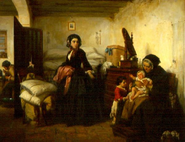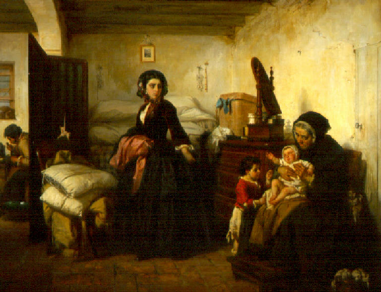 Donna agghindata in atto di uscire abbandona una vecchia che accudisce due bambini ed un uomo che lavora; intorno a loro una stanza poveramente arredata.