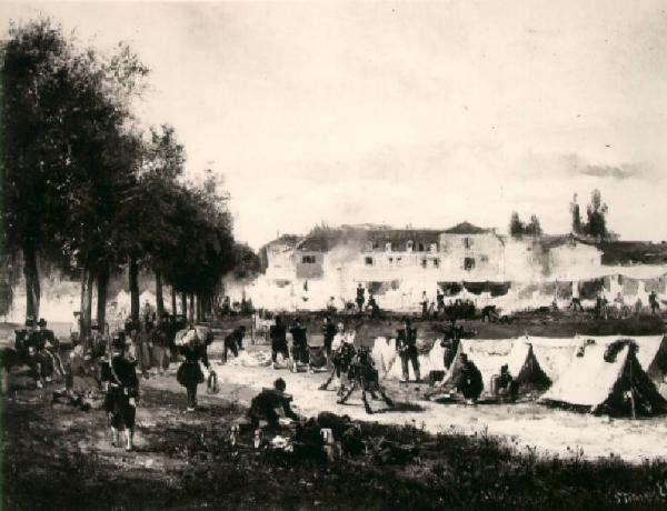 A sinistra, filare di alberi, sotto il quale sono soldati a gruppetti; al centro, tende ed altri uomini, sullo sfondo case.