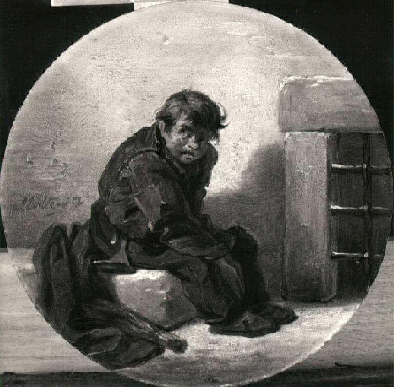 Un giovane spazzacamino siede di tre quarti verso destra, le mani abbandonate tra le gambe, e volge il capo verso sinistra; accanto a lui, a sinistra, la ramazza e il pastrano; a destra, finestra chiusa da una grata.