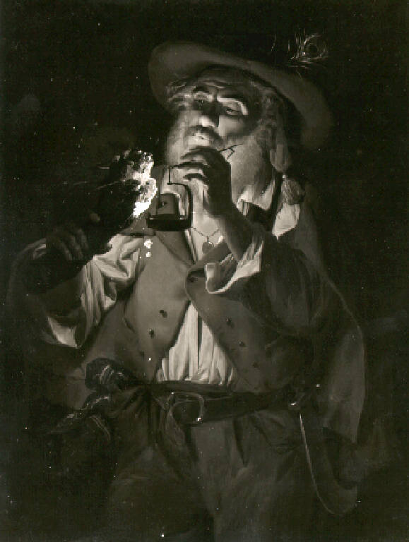 Ritratto a tre quarti e volto verso sinistra un uomo anziano, in abiti contadini e con cappello piumato, tiene nella mano sinistra una piccola lucerna e nella destra un tizzone; dalla cinta gli pende una roncola.