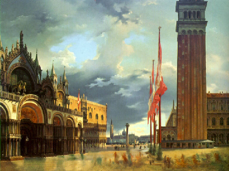 Veduta della piazza di San Marco con la facciata della basilica e del palazzo dei Dogi a sinistra, la torre campanaria a destra; sullo sfondo paesaggio con la colonna sormontata dal leone e l'isola di San Giorgio, in primo piano gli schizzi dei personaggi incompiuti.