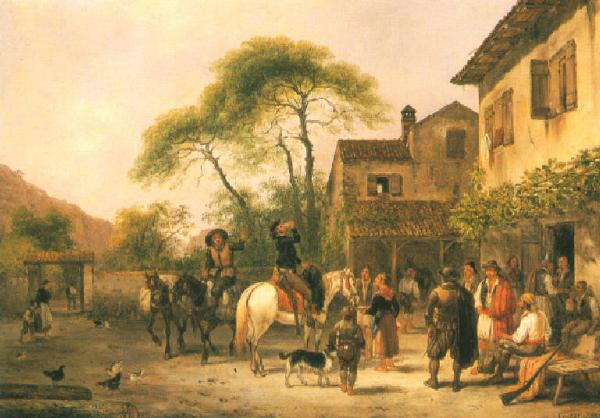 Al centro, all'interno del cortile di un cascinale, due uomini a cavallo, uno di loro sta bevendo da un boccale; a destra un gruppo di persone, alcune sono sedute sotto una pergola; nel cortile razzolano dei gallinacei.