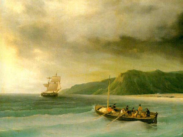 In primo piano, a sinistra, sul mare increspato una scialuppa sta avanzando verso un veliero; sullo sfondo paesaggio con la costa sotto un cielo nuvoloso.