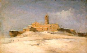 Al centro il Castello di Brescia sotto la neve, davanti ad esso vi sono alcune figurine appena abbozzate.