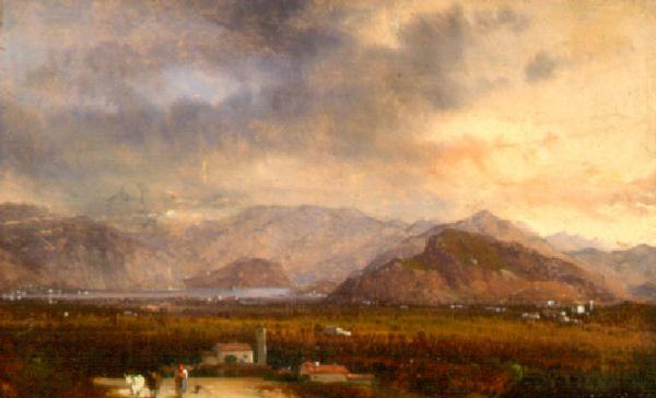 Veduta della Franciacorta, sullo sfondo il lago d'Iseo; in primo piano una contadina accompagna due vacche.