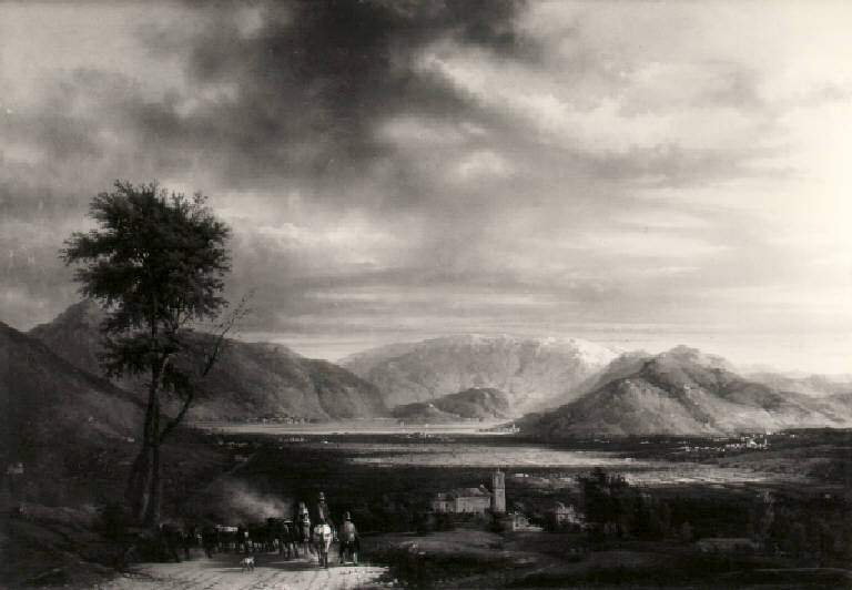 Veduta del lago d'Iseo sullo sfondo paesaggio con montagne innevate; in primo piano un gruppo di contadini si dirige verso un paese.