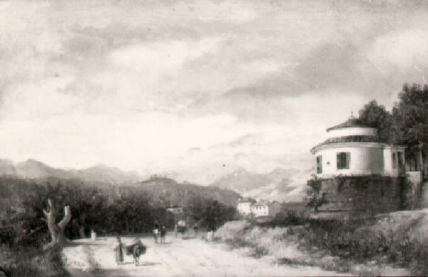 In primo piano alcuni contadini sulla strada a destra gli spalti di San Giovanni, sullo sfondo paesaggio con le colline bresciane.