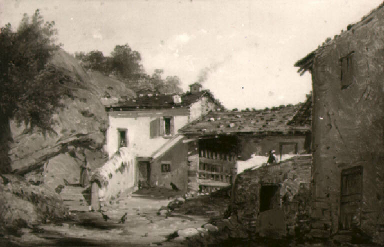 Veduta di alcuni masi di montagna, a destra una contadina.