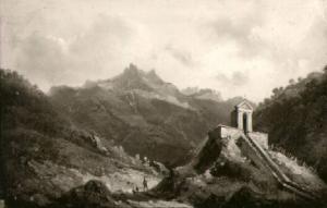 A destra, su una altura, una piccola santella cui si accede da una lunga scala, in basso nel vallone un contadino; sullo sfondo le montagne.