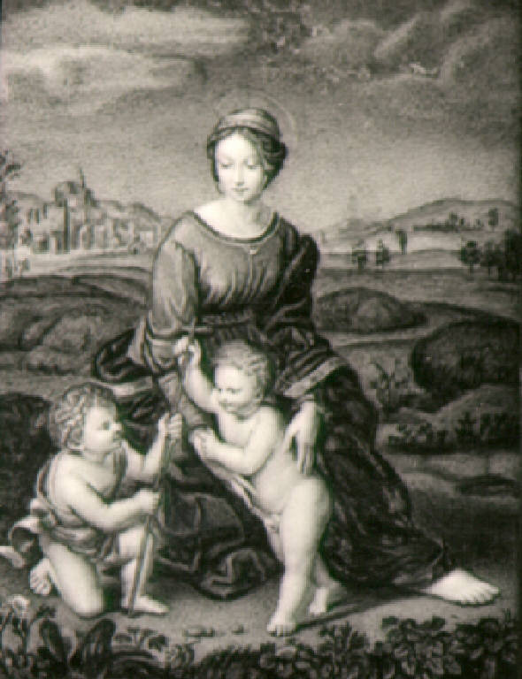 La Madonna con Gesù Bambino e San Giovannino che porta la croce sullo sfondo il paesaggio.