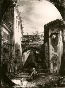 Al centro una coppia sale per una scalinata compresa tra due case, dai balconi pendono fiori; alcune persone sono affacciate alla balconata che attraversa la strada.