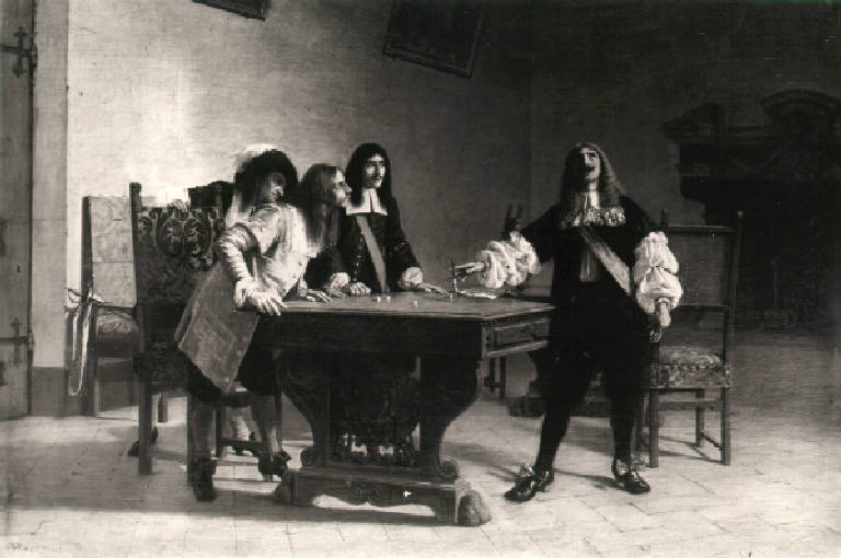 In una stanza con caminetto sul fondo, quattro uomini in abito seicentesco sono attorno ad un tavolo sul quale si trovano dei dadi ed uno stiletto conficcato.