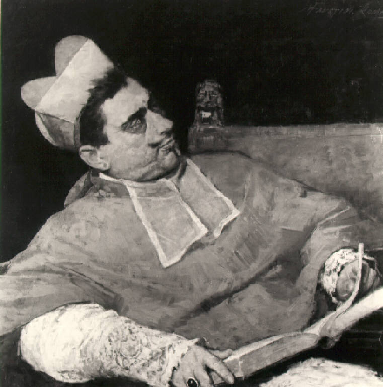 Ritratto d'uomo, busto, con vesti da cardinale, seduto su una sedia ad alto schienale, volto di tre quarti a sinistra, nell'atto di sfogliare un libro.