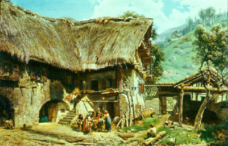 Nel cortile di una cascina alcune figure svolgono le occupazioni quotidiane; sullo sfondo, la costa di una collina con case montane.
