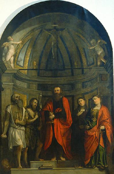 San Paolo tra San Girolamo, San Giovanni Battista, Santa Maria Maddalena e Santa Caterina d'Alessandria; nel catino absidale Cristo crocifisso tra due putti che reggono un velo
