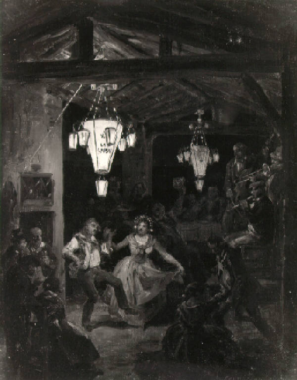 All'interno di un locale con tetto con travi a vista una coppia danza mentre altre coppie stanno sedute; a destra dei suonatori e sullo sfondo commensali seduti ad un tavolo imbandito; dal soffitto.
