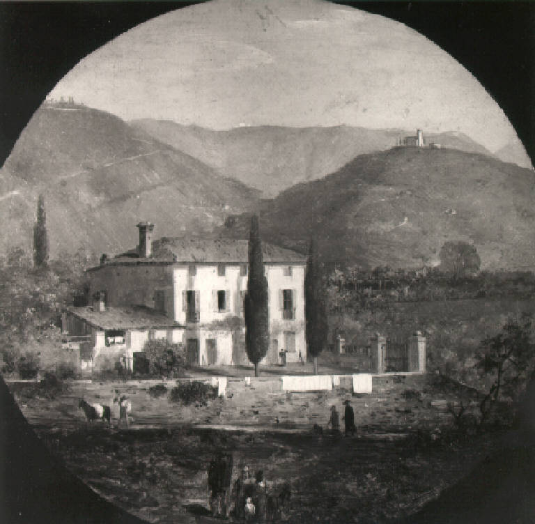 Veduta di una villa circondata da un basso muro, nel cortile due cipressi, davanti alla villa alcuni personaggi tra cui un sacerdote, sullo sfondo i colli ed una chiesa sulla cima di uno di essi.