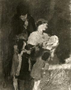 A destra, in piedi, il padre si china in avanti verso la madre che, seduta di tre quarti verso destra, tiene tra le braccia un neonato; a sinistra altri tre bambini, quello in primo piano appoggiato alla culla (?), assistono alla scena.