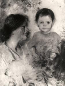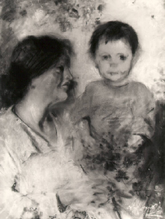 Donna posta di tre quarti, con i capelli raccolti sulla nuca, tiene in braccio una bimba vista frontalmente, con i capelli corti.