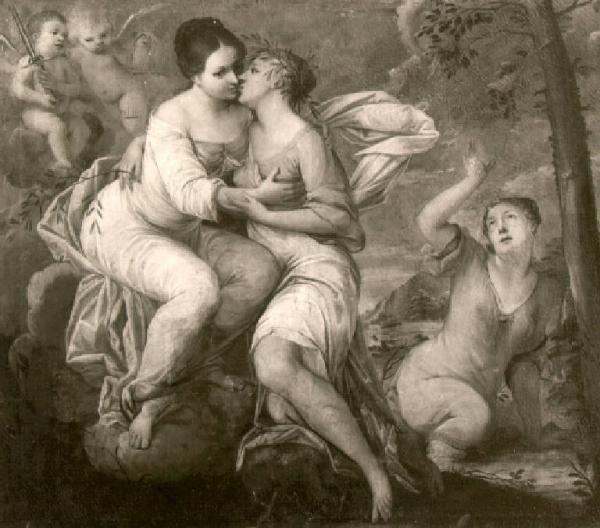 Due figure femminili si abbracciano, l'una con il capo cinto (ramoscelli d'olivo?); a destra, una terza fa l'atto di sollevarsi poggiando una mano a terra, mentre nell'altra brilla un sole; in secondo piano, a sinistra, due angioletti con spada e bilancia (forza e giustizia).