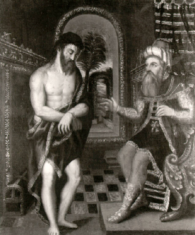 A destra, seduto su un trono intagliato Pilato con ricche vesti indica, davanti a lui, Gesù Cristo, con corona di spine e mantello. La scena si svolge in una sala con finestra centrale aperta su un paesaggio.
