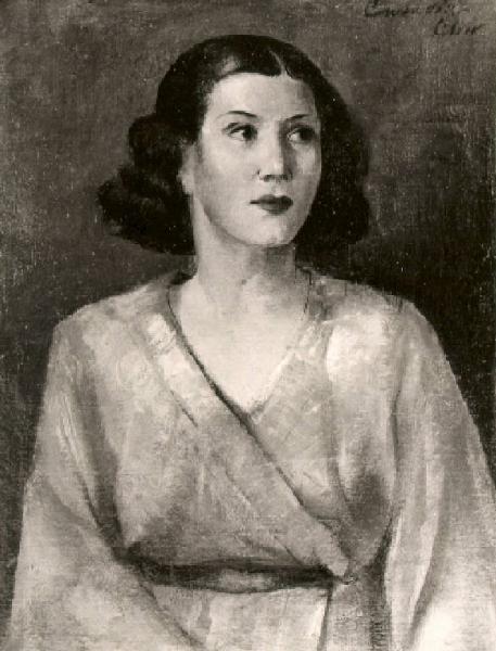 Donna giovane a mezza figura frontale e con testa di tre quarti a destra ha i capelli neri lunghi sino alle spalle ed indossa un abito rosa con scollatura a V.