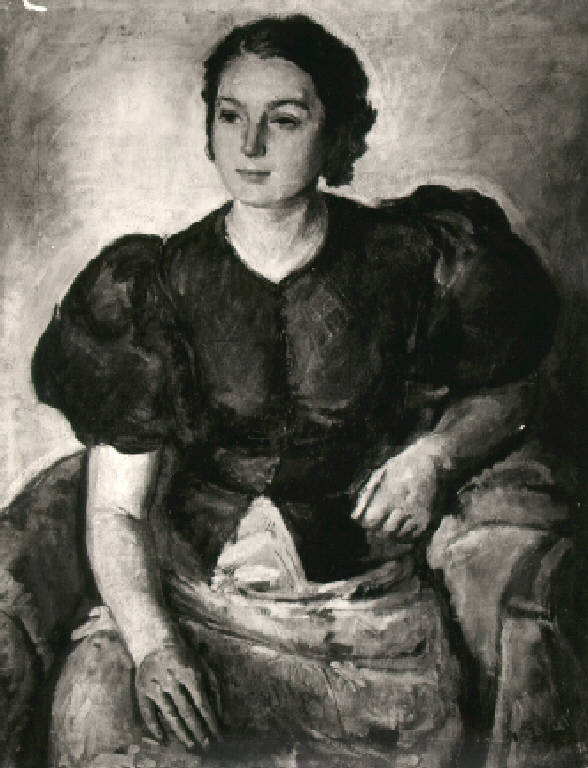 Il personaggio è a mezza figura, seduta, il viso leggermente volto verso sinistra, un braccio poggiato sul bracciolo della poltrona, l'altro in grembo.
