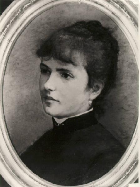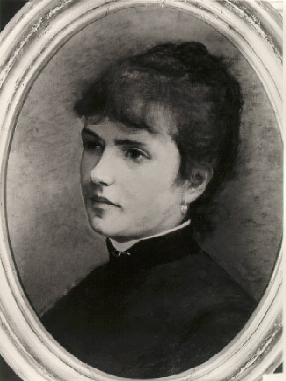 Ritratto di giovane donna a mezzo busto, volta di tre quarti verso sinistra; ha i capelli raccolti ed indossa una veste grigia con colletto di velluto nero chiuso da una spilla, dal quale sporge il bianco della camicia.