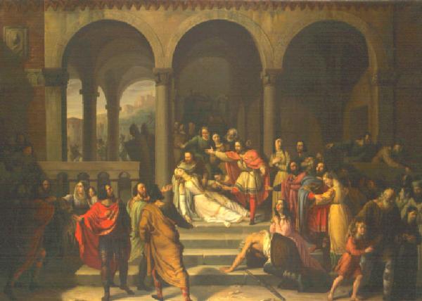 Al centro Scomburga esanime viene mostrata al popolo di Brescia che dimostra il suo dolore con vari atteggiamenti, sullo scalone il padre è assassinato da sicari; sullo sfondo paesaggio bresciano con castello e Duomo vecchio.