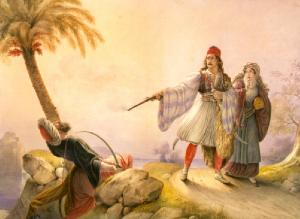 A destra una coppia vestita alla greca: la donna tiene sotto il braccio un cofanetto, l'uomo spara ad un turco seduto a sinistra sotto una palma; sullo sfondo il paesaggio con il mare e la rocca di una città.